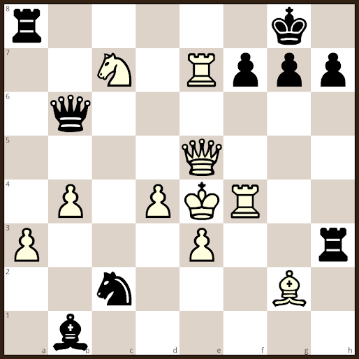 Las negras dan jaque mate en una jugada. Escribe el nombre de la pieza y la casilla donde hay que llevarla para conseguirlo.